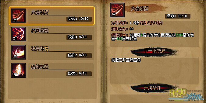 职业技能六合斩劈等级达到10级时,属性还是非常强大的。冷却时间:1.2秒,消耗法力:60,技能效果:对距离4格内的单体目标造成128%基础伤害+600固定伤害。