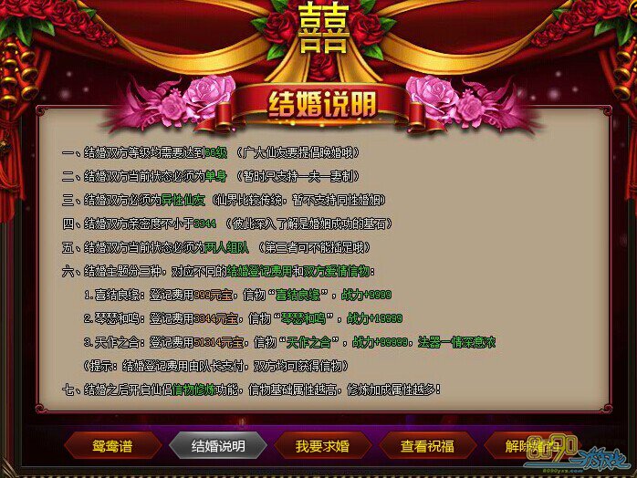 各位仙友是不是很动心呢,仙界虽好,孤单一人也会寂寞哦。赶紧参加鸳鸯谱结婚哦,还可提升战斗力。