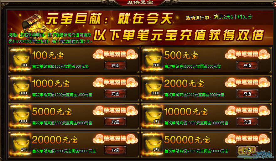 双倍元宝规则,开服活动期间, 只要充值相应的金额即可领取一次100%非绑定元宝奖励,每个元宝额度仅限一次。游戏开区的当天总共三天时间,每个区服只有一次机会哦!