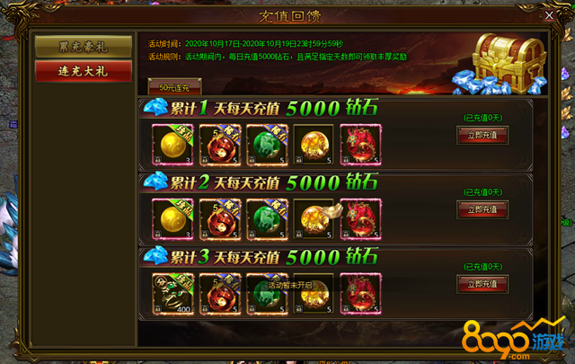 活动说明:活动期间,每日充值50元,达到指定天数,即可领取豪华大礼