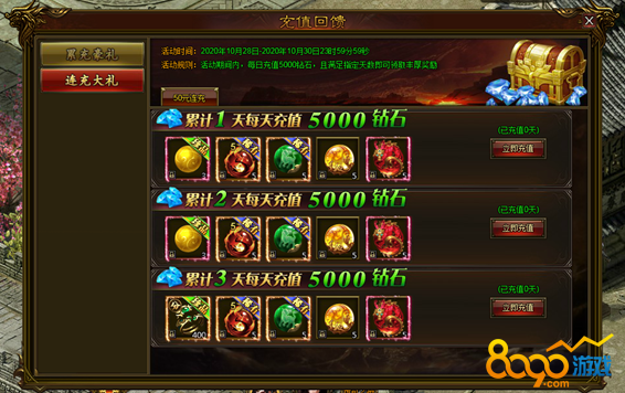 活动说明:活动期间,每日充值50元,达到指定天数,即可领取豪华大礼