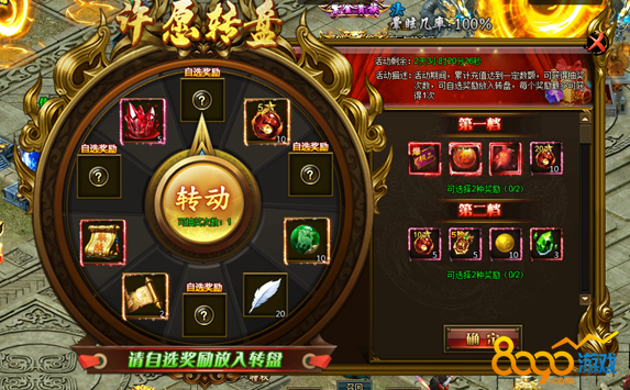 活动说明:活动期间,累计充值达到一定数额,可获得抽奖次数,可自选奖励放入转盘,每个奖励最多可获得1次