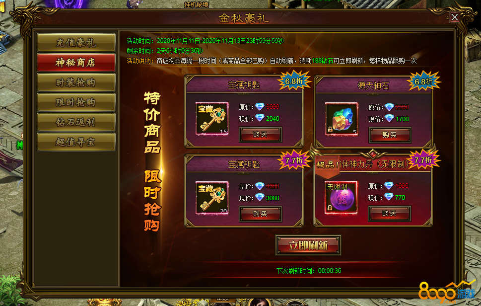 活动说明:活动期间,商店每隔一段时间自动刷新,消耗钻石可立即刷新,每次刷新每样物品仅可限购一次