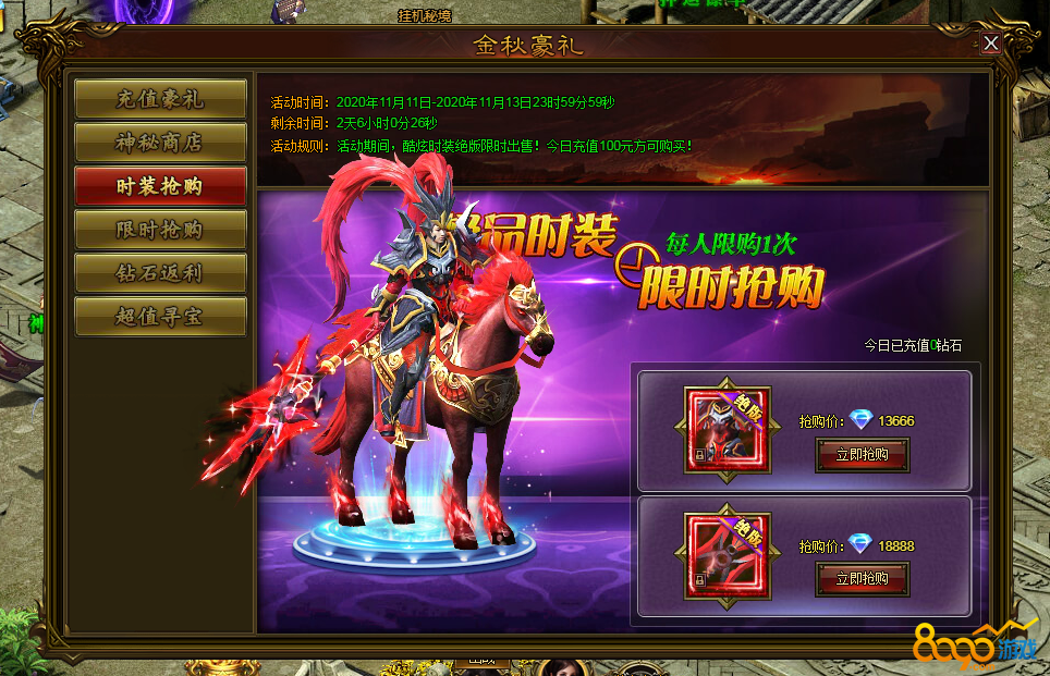 活动说明:酷炫时装限时出售,满足今日充值钻石额度方可购买!每件商品仅售1次