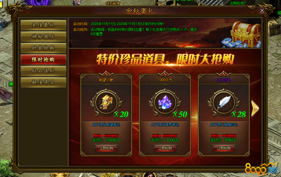 活动说明:活动期间,极品材料降价限时抢购!每个礼包每日只可购买一次,0点重置