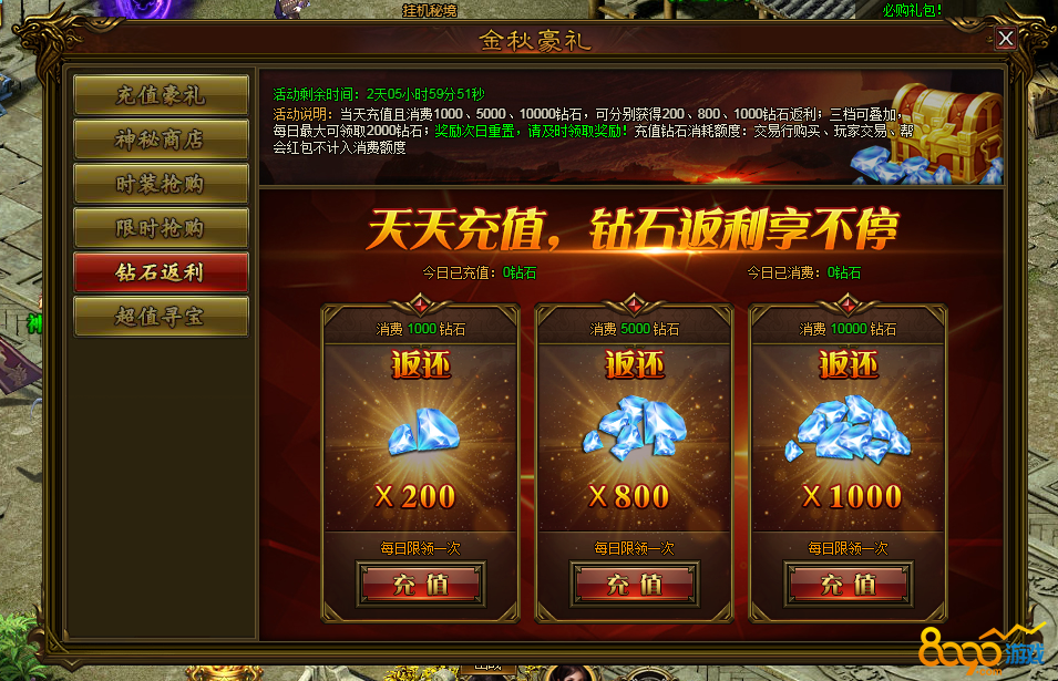 活动说明:当天充值且消费1000、5000、10000钻石,可分别获得200、800、1000钻石返利;三档可叠加,每日最大可领取2000钻石;奖励次日重置,请及时领取奖励!