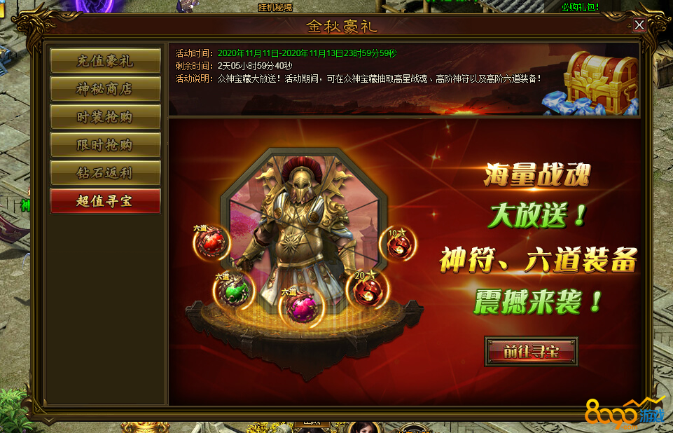 活动说明:众神宝藏大放送,活动期间,可在众神宝藏进行抽奖,高概率获得高阶神符、高阶六道装备、海量高星战魂!
