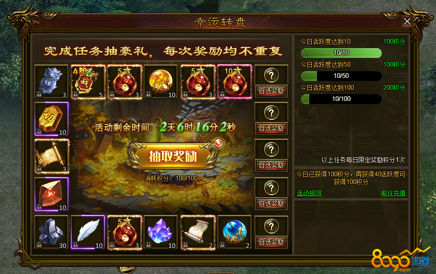 1.自选锁定所有奖励后才可进行转盘抽奖