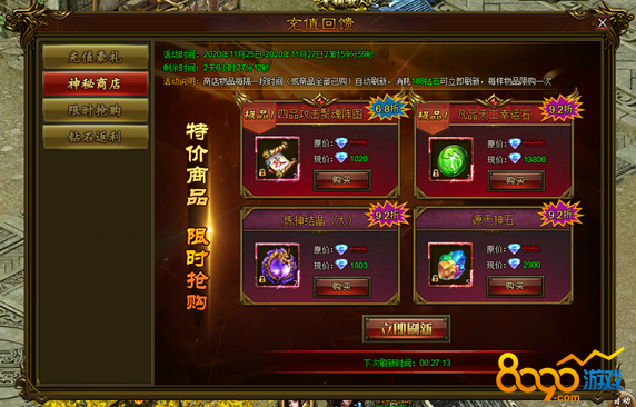 活动说明:活动期间,商店每隔一段时间自动刷新,消耗钻石可立即刷新,每次刷新每样物品仅可限购一次