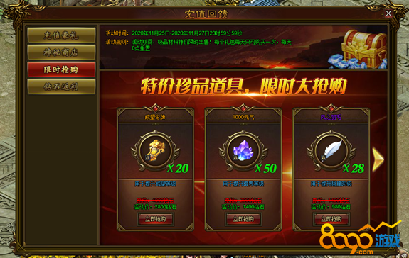 活动说明:活动期间,极品材料降价限时抢购!每个礼包每日只可购买一次,0点重置