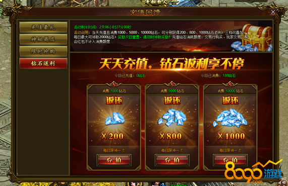 活动说明:当天充值且消费1000、5000、10000钻石,可分别获得200、800、1000钻石返利;三档可叠加,每日最大可领取2000钻石;奖励次日重置,请及时领取奖励!