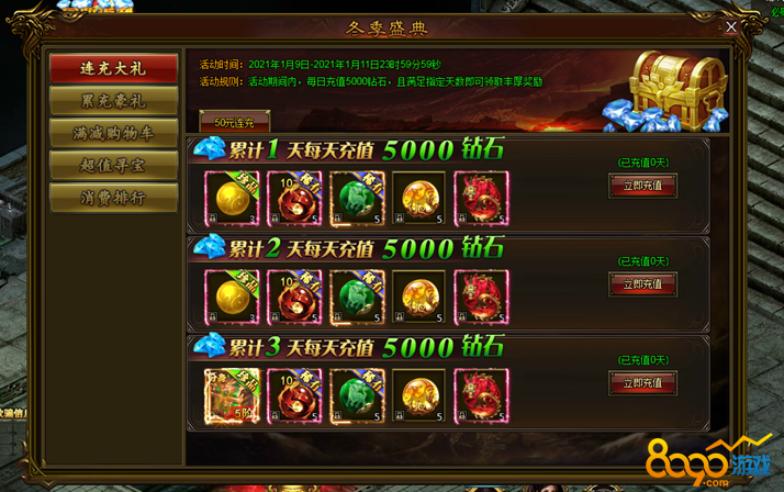 活动说明:活动期间,每日充值50元,达到指定天数,即可领取豪华大礼