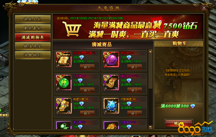 活动说明:活动期间,选择商品加入购物车,累计达到一定额度可减免所消耗的钻石!购物车商品累计额度越多,减免钻石越多~!