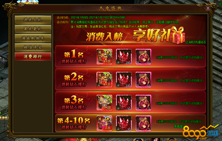 活动说明:自活动生效起,消费50000充值钻石可参与排行;前3名需消费指定钻石方可参与名次抢夺!活动结束,停止排行,奖励通过邮件发放;