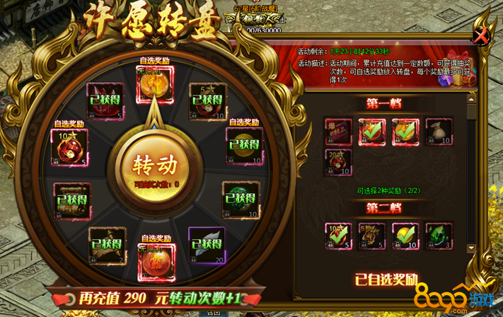 活动说明:活动期间,累计充值达到一定数额,可获得抽奖次数,可自选奖励放入转盘,每个奖励最多可获得1次