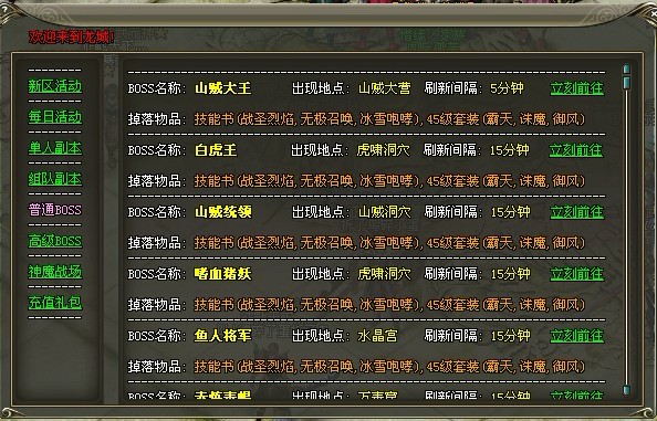这里面会有BOSS的地点刷新时间掉落装备还有自动寻路,怎么样,是不是很方便呢?