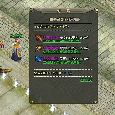 首相要再商城里面购买神螺来召唤地狱炎魔,打败地狱炎魔之后会爆出积分,当然不买神螺的话也可以,但是说实话,要弄到那么多积分的话,实属不易。然后找到积分使者拿足够的积分区兑换武器。
