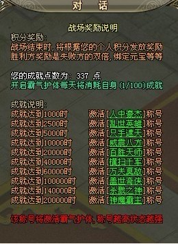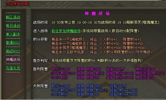 龙城每天晚上的19:00-19:30时间段,龙城“神魔战场”是众多勇相互较量士的地方,神魔里玩家们可以尽情睇相互PK,不需要害怕死后掉装备,杀敌之后还可以获得相应的成就积分,喜欢PK的玩家,这个活动绝对不能错过。