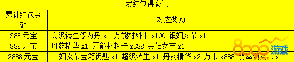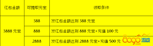 点击立即抢红包按钮可获得3888元宝红包,达到指定条件即可领取对应数量元宝(每人仅限领取一次)