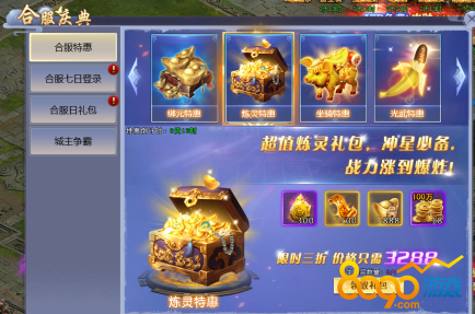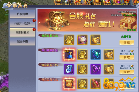 ●合服日礼包:合服期间每日可领取和购买超值日礼包,持续7天