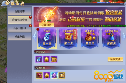●合服七日登录:合服期间连续登录可领取7日超值奖励,激活古剑赐福还可日日领取炼灵大礼包