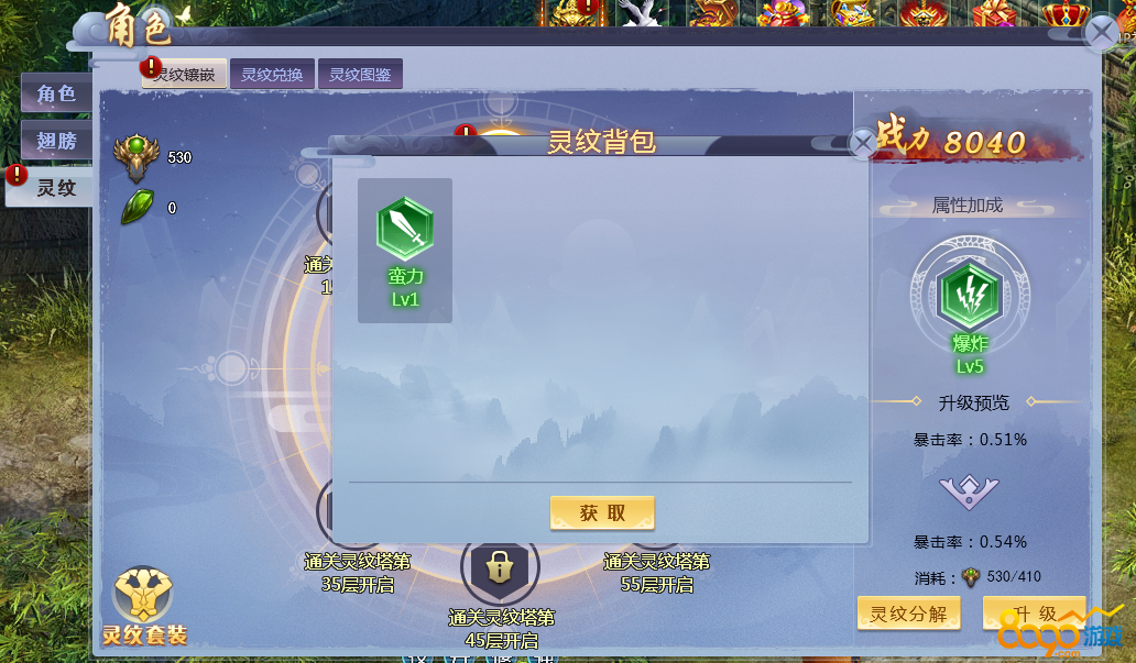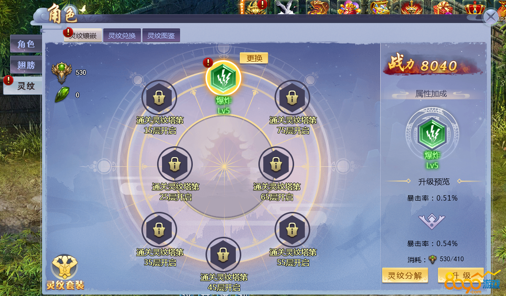 镶嵌的灵纹可以进行升级,升级材料从灵纹塔中获得。升级可以提升战力和属性。身上镶嵌的灵纹等级达到一定程度还能激活灵纹套装。