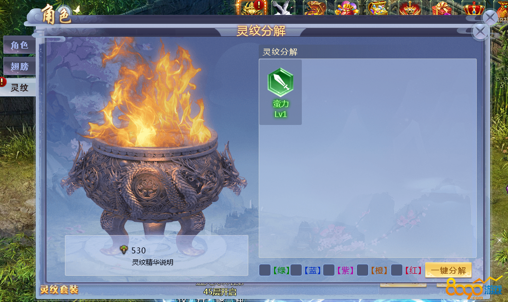 灵纹分解可以获得灵纹升级的材料,蓝色和绿色的灵纹可以用于分解,获得升级材料再给灵纹进行升级。