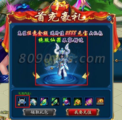 注意事项:为了感谢广大玩家对8090古剑奇侠的厚爱,在新区,第1次为账号充值时,无论金额多少,都将额外获得一份系统赠送的首充礼物,酷炫仙器!