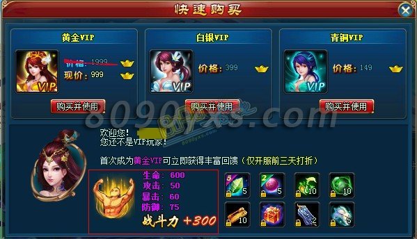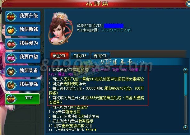 激活黄金VIP将获得闪亮的黄金VIP礼包,使用后直接增加人物属性(生命+300,攻击+30,暴击+60,防御+75),暴涨战斗力!更有强化石、成长丹、仙器道具、宝石礼包、嫦娥宝鉴等一系列珍贵道具,成为黄金VIP可畅享多项特权,你还在等什么,快快加入黄金VIP的大家庭吧!还有专属小师妹哦!