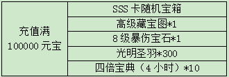 活动期间内,累积充值满20000元宝、50000元宝、100000元宝可领取SSS随机卡宝箱、高级许愿书、高级藏宝图、史诗福袋等稀有道具奖励,可叠加领取(仅限10月1日期间,错过再等一年)