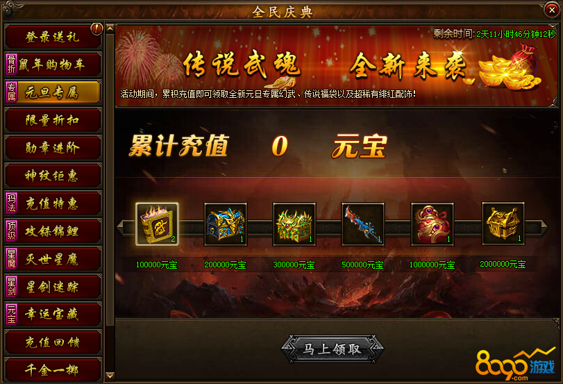 活动说明:活动期间累计充值对应元宝即可免费领取高级许愿书、配饰进阶石自选箱(小)、神尊徽章随机宝箱、元旦专属幻武冰火两极刀、传说武魂福袋、绯红配饰随机宝箱等极品道具等你来领!精彩豪礼,不容错过。