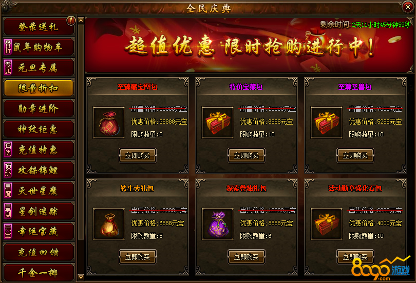 活动说明:活动期间限时推出特价限量道具,新增至臻藏宝图包(内含高级藏宝图、中级藏宝图*5)、宝藏钥匙包、至尊圣兽包、转生大礼包、探索卷轴礼包以及全新活动勋章强化会礼包大放送,每日重置限购,机不可失,先到先得。