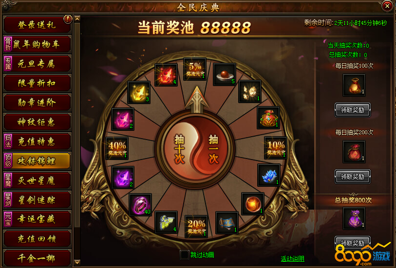 活动说明:活动期间,全新锦鲤奖池红品进阶石、金品进阶石、粉品进阶石、以及海量元宝!达到指定次数还可直接免费领取16转装备宝箱!参与大转盘必得珍贵道具,更有几率获得高额元宝奖励!