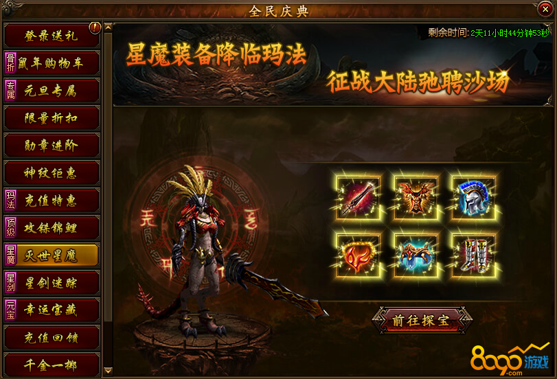 活动说明:超强星魔装备限时加入宝藏,集齐指定装备即可获得超强套装属性加成!战力直线飙升,战场由你主宰!
