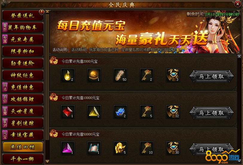 活动说明:活动期间当天累计充值20、100、500元即可领取丰厚奖励。