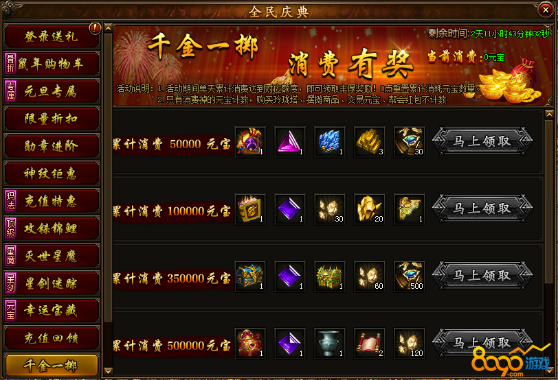 活动说明:全新千金一掷上线,活动期间每日累计消费达到一定额度,即可免费领取高级许愿书、超级技能宝箱、传说武魂福袋、10~16转装备自选宝箱、随机极品星座符文宝箱等极品道具,奖励每天充值!