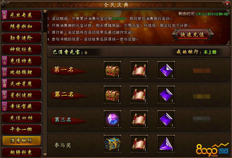 活动说明:活动期间累计消费30万元宝以上即可参与消费排名获得极品奖励,排名靠前奖励更好,10~14转装备自选宝箱、10~16转装备自选宝箱等高级道具等你来拿!