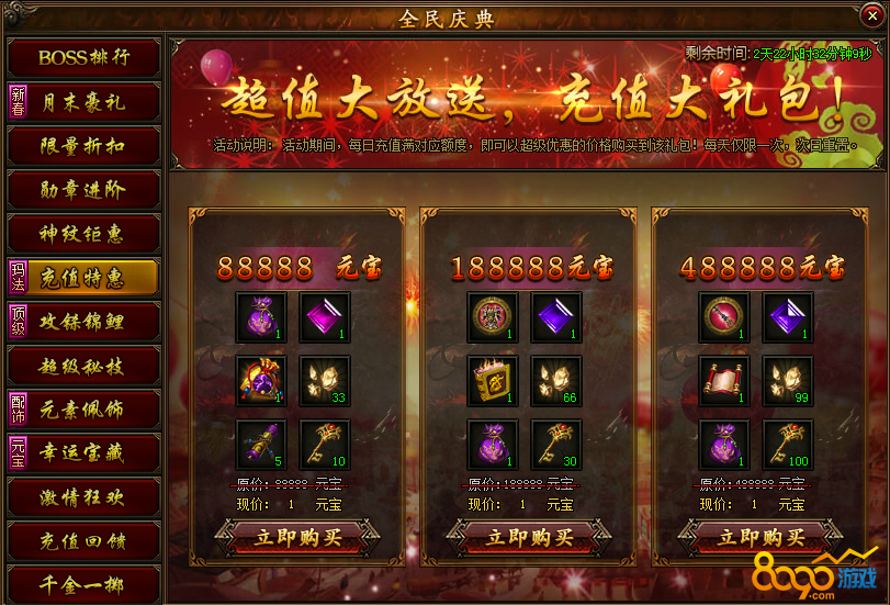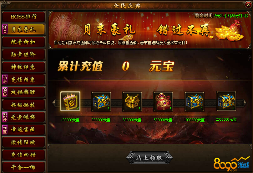 活动说明:活动期间累计充值对应元宝即可免费领取高级许愿书、印记自选箱、12~14转神圣副装宝箱、传说武魂福袋、顶级自选箱、春节自选箱(可自选绯红配饰随机箱、极品星座随机宝箱、聖龍战刃)等极品道具等你来领!精彩豪礼,不容错过。