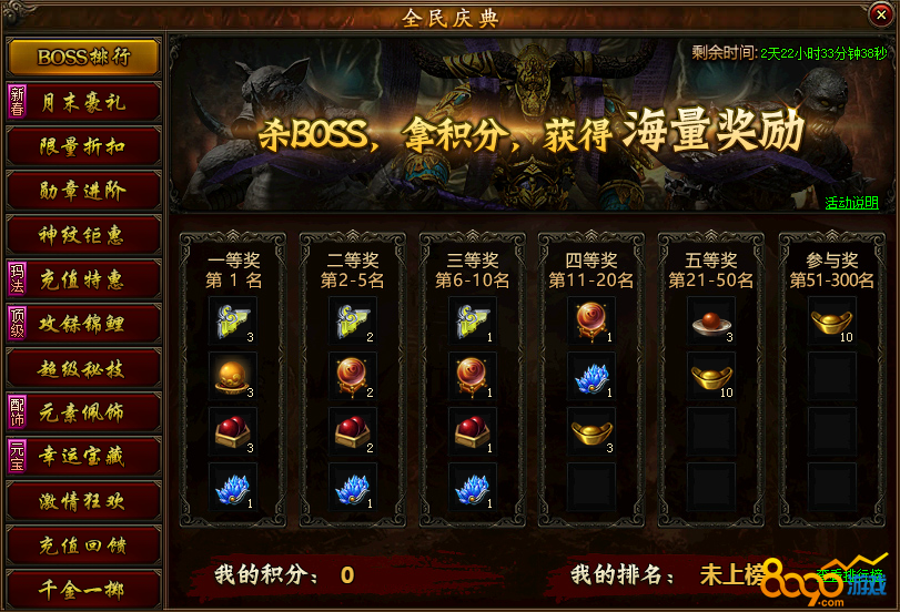 活动说明:活动期间,击杀任意BOSS均可掉落BOSS积分卷轴,使用后可获得BOSS积分,根据BOSS积分排行可获得不同的排行奖励,排行奖励在活动结束时以邮件的方式进行发放。