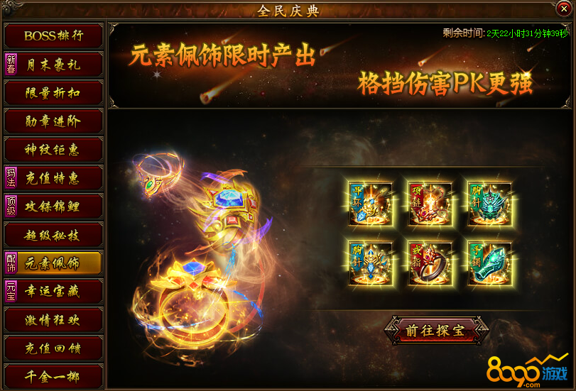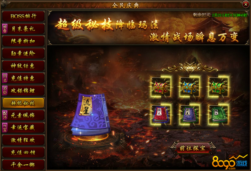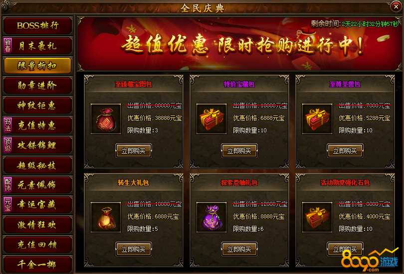 活动说明:活动期间限时推出特价限量道具,新增至臻藏宝图包(内含高级藏宝图、中级藏宝图*5)、宝藏钥匙包、至尊圣兽包、转生大礼包、探索卷轴礼包以及全新活动勋章强化石礼包大放送,每日重置限购,机不可失,先到先得。
