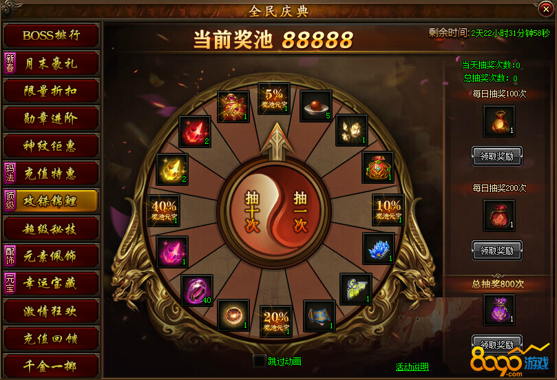 活动说明:活动期间,全新锦鲤奖池红品进阶石、金品进阶石、粉品进阶石、以及海量元宝!达到指定次数还可直接免费领取16转装备宝箱!参与大转盘必得珍贵道具,更有几率获得高额元宝奖励!