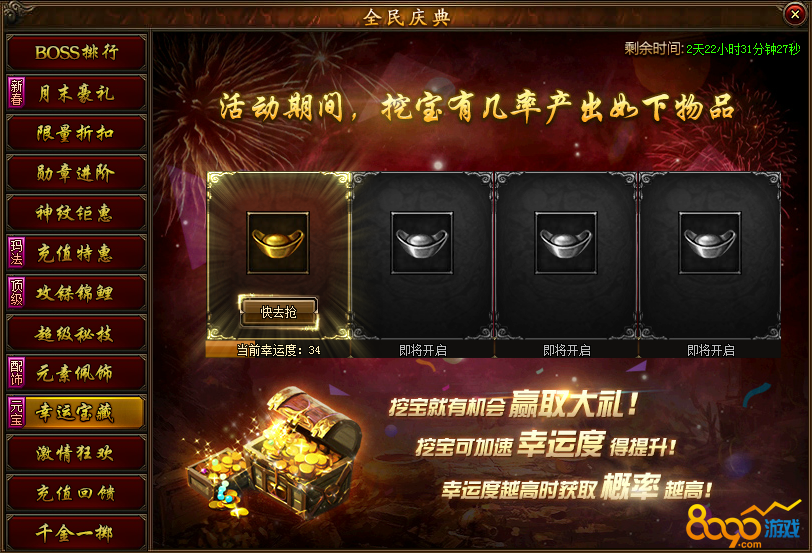 活动说明:幸运宝藏劲爆来袭,活动期间挖宝就有机会赢取元宝大礼!挖宝可加速幸运度提升,幸运度越高时获取元宝概率越高!