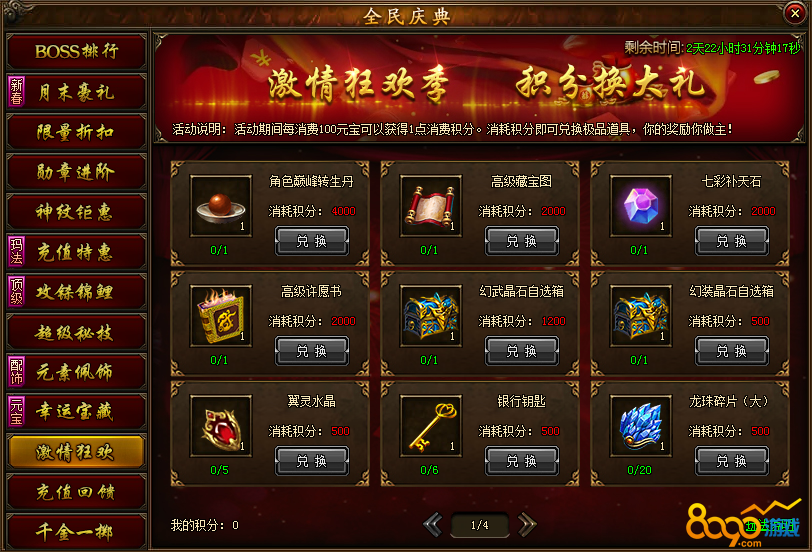 活动说明:活动期间每消费100元宝可以获得1点消费积分,消费积分即可兑换极品道具奖励,更有角色巅峰转生丹、高级藏宝图、七彩补天石、高级许愿书等道具等你来换!你的奖励有你主导!