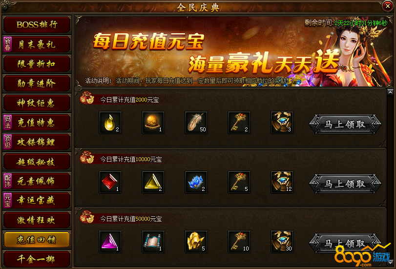 活动说明:活动期间当天累计充值20、100、500元即可领取丰厚奖励。