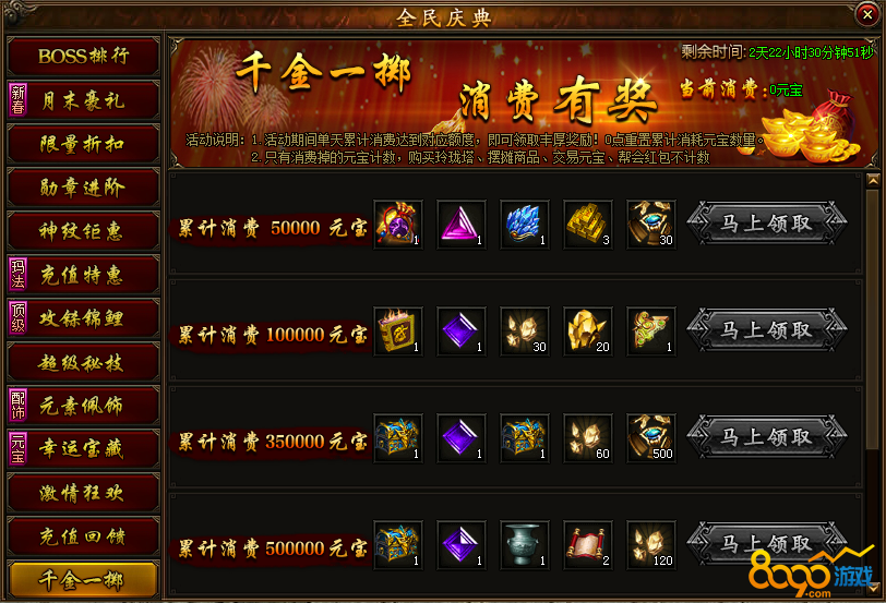 活动说明:全新千金一掷上线,活动期间每日累计消费达到一定额度,即可免费领取高级许愿书、超级技能宝箱、天龍首饰结晶宝箱、10~16转装备自选宝箱、随机极品星座符文宝箱等极品道具,奖励每天充值!