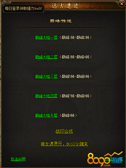 4. 全新16转战印来袭,大幅增长基础属性以及极品属性,玩家可寻找NOC远古遗迹进入巅峰地图,击杀巅峰BOSS即有概率掉落16转战印以及海量天晶石,巅峰层数越高,掉落战印几率越高,掉落天晶石数量越多。