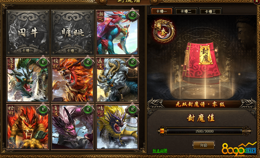卡槽可直接花费8800元宝开启永久的使用权限,封魔卡牌等级为R囚牛、嘲风、睚眦、蒲牢、狻猊、赑屃、狴犴、负屃以及螭吻。