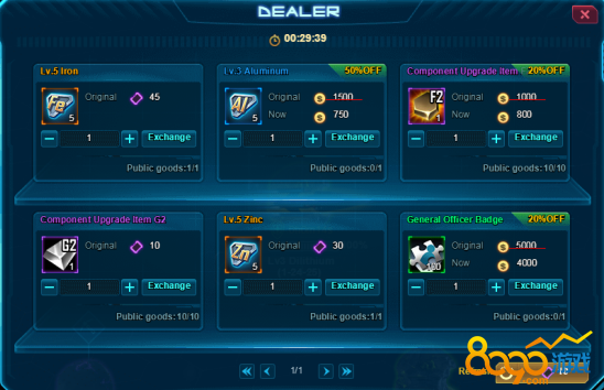 如何判断应该买哪些物资其实很简单,就是看折扣,如果你刷到50%OFF甚至以上的折扣,请毫不犹豫的购买,这肯定划算,而20%的OFF就请自行判断,如果是NA或MG就可以考虑,其它资源就不划算了。还有就是有些是要IC售卖的,IC多的玩家可以考虑在高百分比OFF情况下购入,非付费玩家主要考虑用星际货币兑换,所以建议无论何时,手中尽量保留1万以上的星际货币,用于在DEALER里购买物资。比如下图中的LV3 AI(我只买了它,因为有50%的折扣,哈哈),就应该买入,肯定不会亏本。