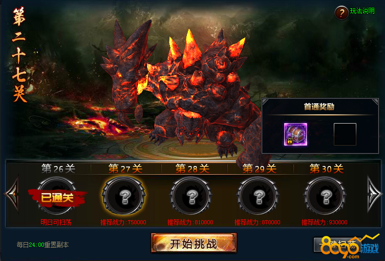 过关斩将一共有30关,每关都会有推荐的战斗力,玩家可以对照自己的战斗力进行对比,适不适合挑战。过关战将每日24:00重置副本
