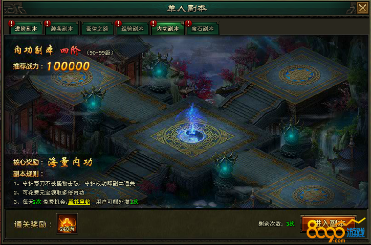 玩家每天可以进入2次内功副本,至尊皇钻额外增加1次,完成副本后可以通过1倍、2倍或3倍的方式领取经验。